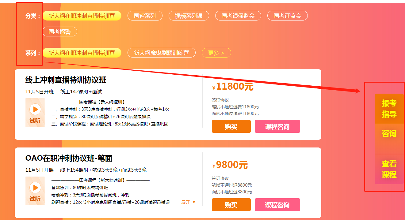 根據課程班次、系列查看班次,需注意:簡章頁上會寫明課程價格、優惠、課程內容、配套服務,請結合個人需求進行學習(如對課程有疑問,可點擊右側邊框的報考指導咨詢客服老師)